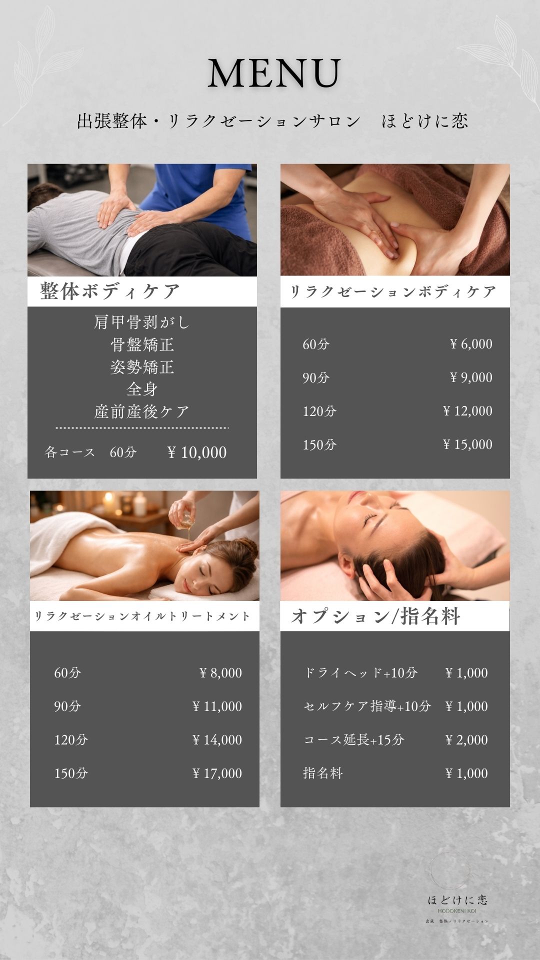 | 当店について | 大阪市で出張マッサージをお探しの方へ。 出張整体・リラクゼーション ほどけに恋は、ご自宅・ホテル・オフィスへお伺いする出張専門サービスです。 「出張マッサージを探している」 「自宅でゆっくり身体を整えたい」 「ホテルでリラックスしながら施術を受けたい」 そんな方に向けて、ほどけに恋では出張整体・リラクゼーションをご提供しています。 一般的に出張マッサージを探される方の多くは、肩や首まわりの重だるさ、腰まわりの疲れ、全身の疲労感などを、自宅やホテルでゆっくりケアしたいと考えています。 ほどけに恋では、ボディケア・リラクゼーション・オイルトリートメントを中心に、お身体の状態に合わせた施術内容をご案内しています。 大阪市内では、北区・中央区・西区・浪速区・天王寺区・福島区・都島区・淀川区など幅広いエリアに対応し、ご自宅・ホテル・オフィスなどご希望の場所へお伺いしています。 「出張マッサージ」で検索している方にも見つけていただきやすいよう配慮しながら、実際には出張整体・リラクゼーションとして、安心してご利用いただける丁寧なサービスを大切にしています。 出張整体・リラクゼーション ほどけに恋は完全予約制です。 大阪市で出張マッサージをお探しの方、自宅・ホテル・オフィスで落ち着いて身体を整えたい方は、ぜひお気軽にご相談ください。 |